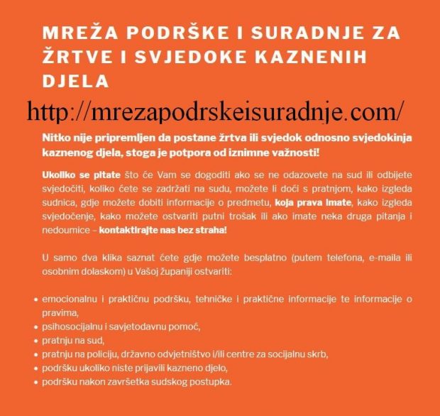 Pružanje svih usluga u okviru rada „Mreže podrške i suradnje za žrtve i svjedoke kaznenih djela“ u potpunosti je besplatno za sve korisnike/ce koji/e nam se obrate za pomoć i podršku.